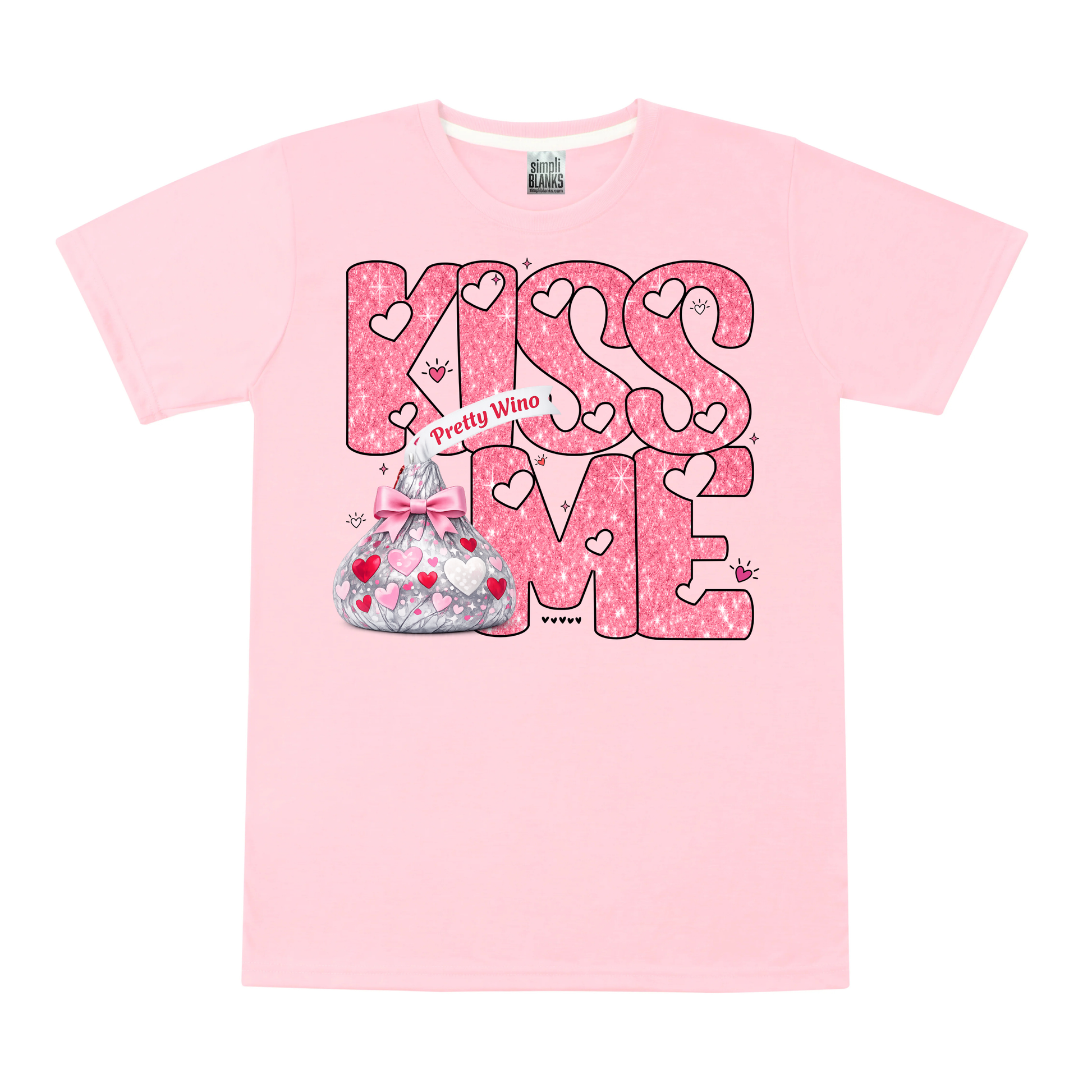 This glittery design features bold “KISS ME” lettering in shimmering pink, sprinkled with hearts and paired with a sweet candy-kiss accent for extra Valentine flair. It’s playful, romantic, and made for anyone who loves cute details with a little sparkle.